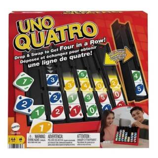 Os fãs dos jogos de cartas UNO vão adorar o jogo para toda a família UNO Quatro, que une o desafio de conseguir quatro peças em uma linha com a estratégia de combinar por cor ou número. Na sua vez, o jogador desliza suas peças em 1 das 7 bandejas, tentando manobrá-las estrategicamente para combinar quatro peças em uma linha. As peças devem tocar outra peça com a mesma cor ou número, já as Peças de Ação especiais mudam o jogo: elas fazem os outros jogadores ficarem com menos peças, uma peça ser empurrada para fora de uma bandeja, e até mesmo duas bandejas trocarem de posição!